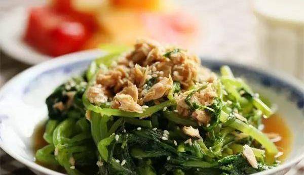 茼蒿一大把;金槍魚罐頭2大勺;生抽1大勺;米醋1/2大勺;白芝麻適量