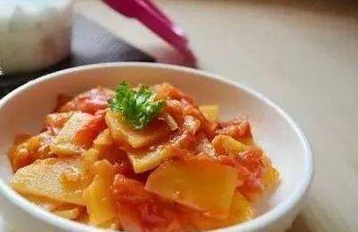 番茄切片,薑切絲,如果喜歡脆的,或者鍋不是不沾的,可以泡一下土豆片炒鍋裡放油,煸香薑絲,放入土豆片不斷翻炒,炒至有些透明放入番茄塊,加一些鹽,小火燒加一些鹽,燒入味即可