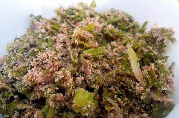 其實用土豆、槐花來做比較好吃,今天用芹菜葉來做……為瞭減肥,也為瞭養血補虛……(用土豆做,就把土豆擦成小絲)芹菜葉洗幹凈,瀝下水分,切碎。把芹菜碎放在面盆裡,加入高粱面、莜麥面、黃豆面、適量的鹽和十三香。(沒有粗糧面,可用白面代替,白面更好吃)用雙手搓或用筷子充分攪拌,讓面粉充分的黏在菜葉上,最好的效果是菜葉上有很均勻的一層面粉。隔水上鍋蒸,20分鐘。如果量多,就在中間挖個小洞,容易熟。蒸熟後,有兩種吃法。方法一:搗蒜泥,加入生抽、香油、辣椒油、老陳醋。拌入不爛子,即可。方法二:熱鍋入油,爆香蔥蒜末和幹辣椒,倒入不爛子,炒香炒散出鍋。(推薦方法二,炒一下更好吃)