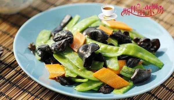 制作:燒鍋水加入少許鹽和油,將荷蘭豆放進去焯水,燙變色後撈出;加入黑木耳進去焯煮熟;熱鍋涼油,放入胡蘿卜片進去煸炒,加入泡軟黑木耳進去翻炒幾下,加入荷蘭豆進去翻炒,最後加入少許的鹽調味,翻炒均勻。