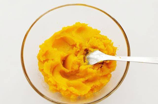第二步,南瓜蒸熟後取出放涼,去掉南瓜皮,將南瓜肉裝入碗中,用勺子壓成南瓜泥,南瓜泥要壓得均勻細膩一點,口感會更好,如果擔心壓得不夠均勻,可以用料理機來協助操作哈,很方便。