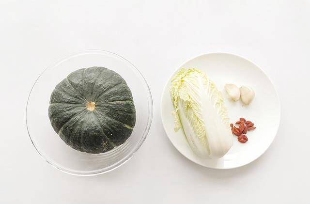 食材:南瓜300克,娃娃菜1棵,枸杞2克。