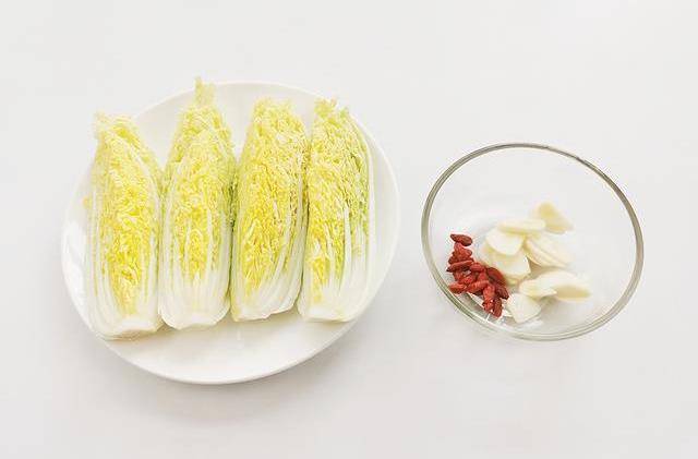 第三步,處理好南瓜後將娃娃菜擇去爛葉洗凈瀝幹,帶根豎著切,分成4份,大蒜去皮切片,枸杞洗凈瀝幹備用。娃娃菜的根部不要去掉,防止菜葉在操作中散掉不成形。
