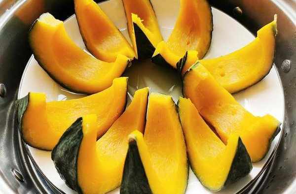 第一步,我們先往蒸鍋裡添適量水用大火滾煮,然後將南瓜洗凈對半刨開,挖出裡面的瓤和籽不用,將南瓜切塊裝入盤子裡,等蒸鍋燒開後放入南瓜,蓋蓋大火蒸上8到10分鐘,能用筷子輕輕紮透的話說明南瓜就熟瞭。