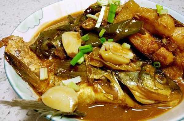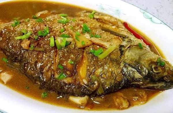 2、鍋內放油,分別將兩半魚煎至兩面金黃;倒入沒過魚身的熱水,加入蒜粒,放入生薑片、紅辣椒段和大蔥,倒入生抽、醋、白酒、鹽,少許糖,大火煮開。