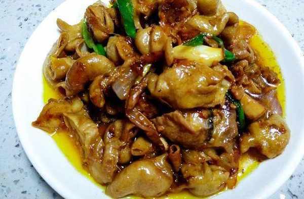3、倒入沒過大腸的熱水,煮沸,轉小火燜煮10分鐘,看到湯汁明顯變少將蔥葉段放入翻炒均勻即可。