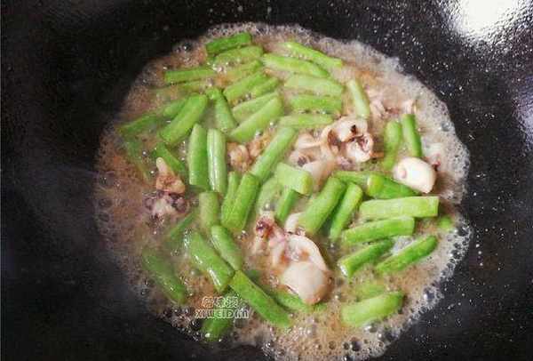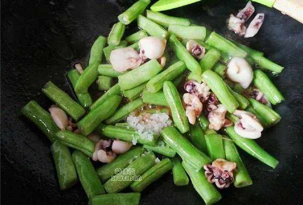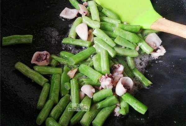 2.墨魚仔預熱就收縮的很快,再把洗凈切段的四季豆倒入翻炒