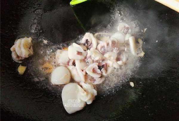 1.熱鍋起油,放入切片的蒜瓣爆香,接著倒入洗凈切好的墨魚仔翻炒(洗墨魚仔,一定去掉黑囊和眼睛黑色部分,不然你燒出來會一鍋黑)