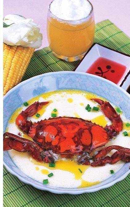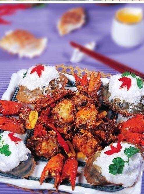 5 鍋內留底油,加入紅油、香辛料炒香後下入蟹肉、蟹殼,烹料酒,放精鹽、味精、雞精粉、香辣醬、白糖拌炒入味後倒入鮮湯稍燜,待湯汁濃鬱時夾出香辛料,勾芡,淋紅油、香油,裝入盤中造型即可。