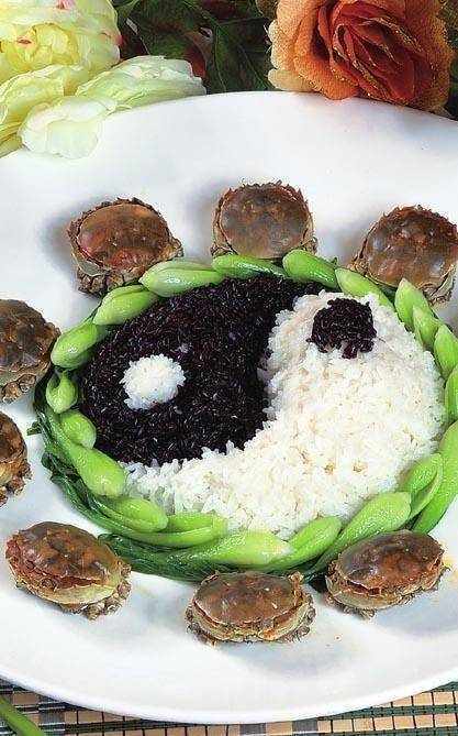 2 鍋內放植物油燒熱,將水發好的海參、魷魚、雞肉、火腿、基圍蝦切米,下入鍋中,放鹽、味精煸炒入味,出鍋後與洗凈的黑米、糯米一起拌勻,上籠蒸熟後,趁熱拌入鹽、味精、胡椒粉,在盤中做成太極形,圍入菜心,點上蟹黃,上籠蒸熟。