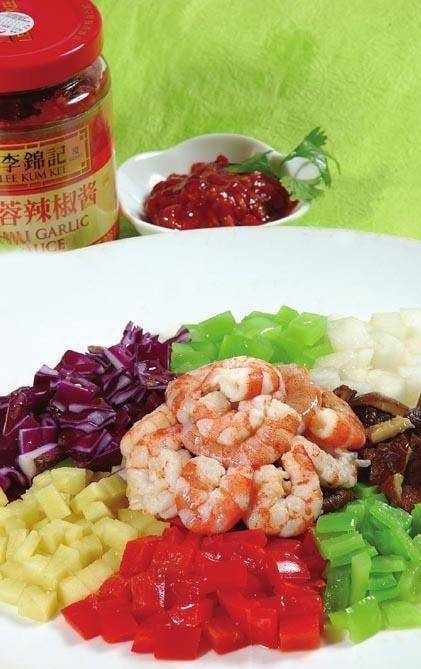 原料:蝦仁 100 克,白蘿卜丁、萵苣丁、青辣椒丁、紅辣椒丁、香菇丁、紫甘藍(紫包菜)丁、冬筍丁各 30 克。