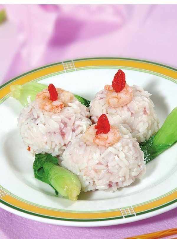 原料:凈蝦仁 500 克,豬五花肉 100 克,水泡糯米 100 克,白菜膽 10 個,枸杞 10 粒。