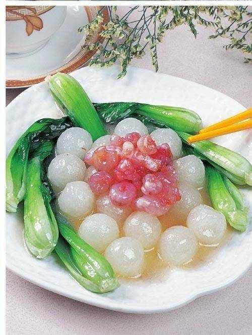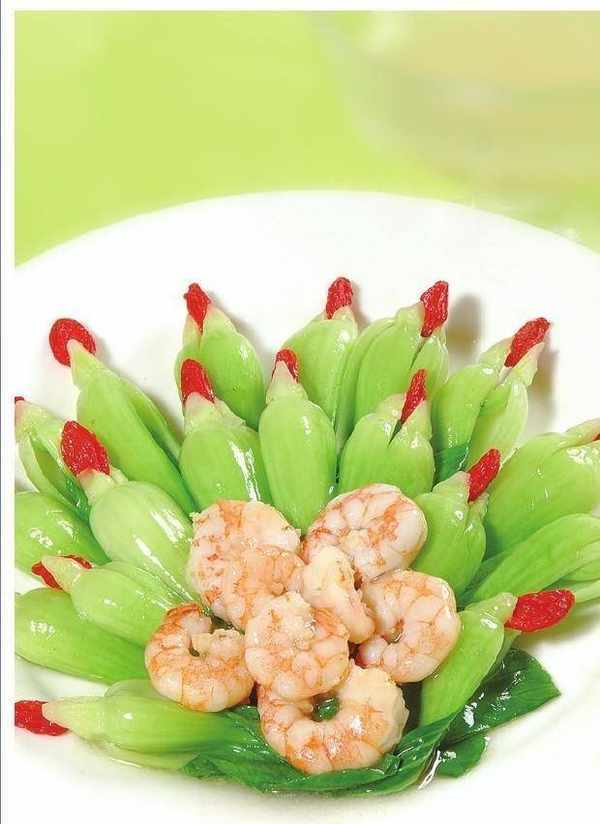 原料:蝦仁 100 克,白菜膽 20 個,枸杞 20 粒。