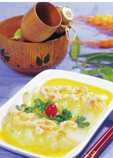 3 鍋內放油 20 克燒熱,倒入蝦仁,放鹽、味精,勾薄芡,淋尾油,出鍋澆淋在冬瓜上即可。要點:此菜的刀工解決瞭冬瓜不好造型的問題。