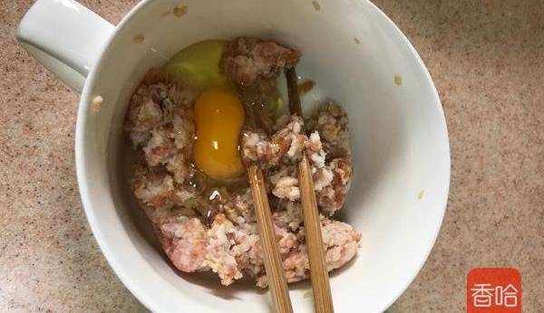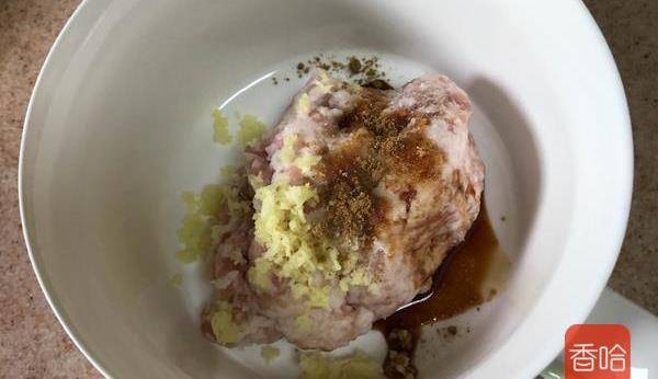 2.薑切成末放入肉末中,再依次放入鹽、生抽、十三香。