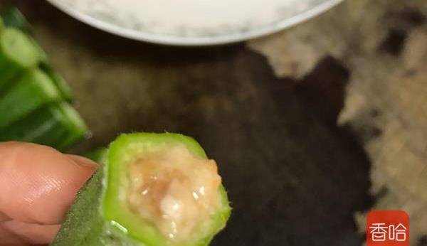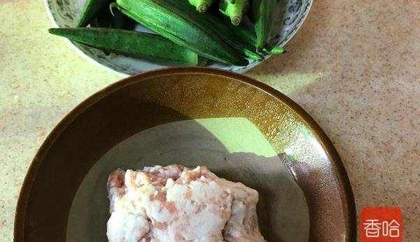 秋葵180g、肉末100g、雞湯適量、薑5g、鹽適量、生抽適量、十三香少許、生粉適量、雞蛋1個
