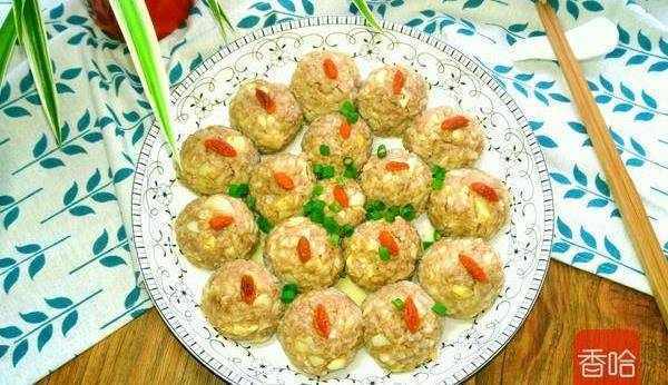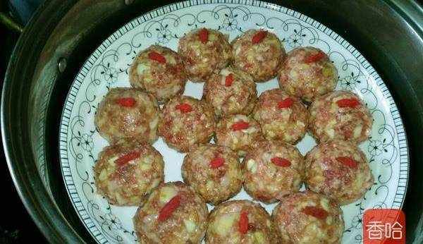 6.捏成圓團,放盤子裡,每個肉丸放一顆枸杞,大火蒸25分鐘,關火燜3分鐘即可。