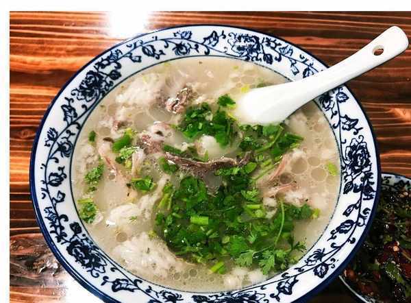 無棣的全羊湯,煮時骨頭肉一起下鍋,要骨頭增鮮,羊用本地產黑山羊,這羊是放養的,肉質緊實,羊肉剁成大塊,下鍋煮,水用礦泉水,加蔥薑胡椒等少許調料,吃個自然味道,肉熟後剔去骨頭,吃時或切塊或切片,下湯鍋中熱透,來一蔥和香菜沫,增加鮮香。這碗湯,不腥不膻,肉質酥爛,湯色乳白,營養豐富,來一個烙餅,溫暖心溫暖胃的一碗好湯!