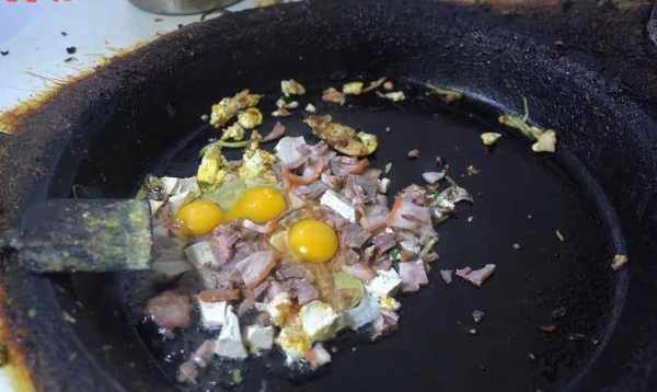 山東出好小麥,搟出來的餅在大鐵鍋中烙熟,彈性十足,麥香味濃;鍋中放入油,豬頭肉,打入雞蛋,翻炒使味道融合,這時候吵得滋滋響的聲音很美妙,火候到瞭,倒入芝麻香油,油得多才行,卷入餅中,一切兩半,這餅就做成瞭。鍋子餅不止有豬頭肉的,還有大腸的、三鮮的、豆腐的,肉絲的,樣數很多,盡供君享。