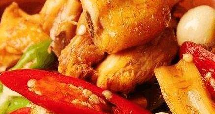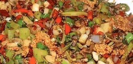2、鍋裡放色拉油燒熱,投入青紅椒節和青花椒先炒幾下,再倒入炸好的雞肉、雞胗肝、雞腸和雞血一起炒,其間加鹽、辣鮮露、味精和雞精調味,出鍋裝盤即成。