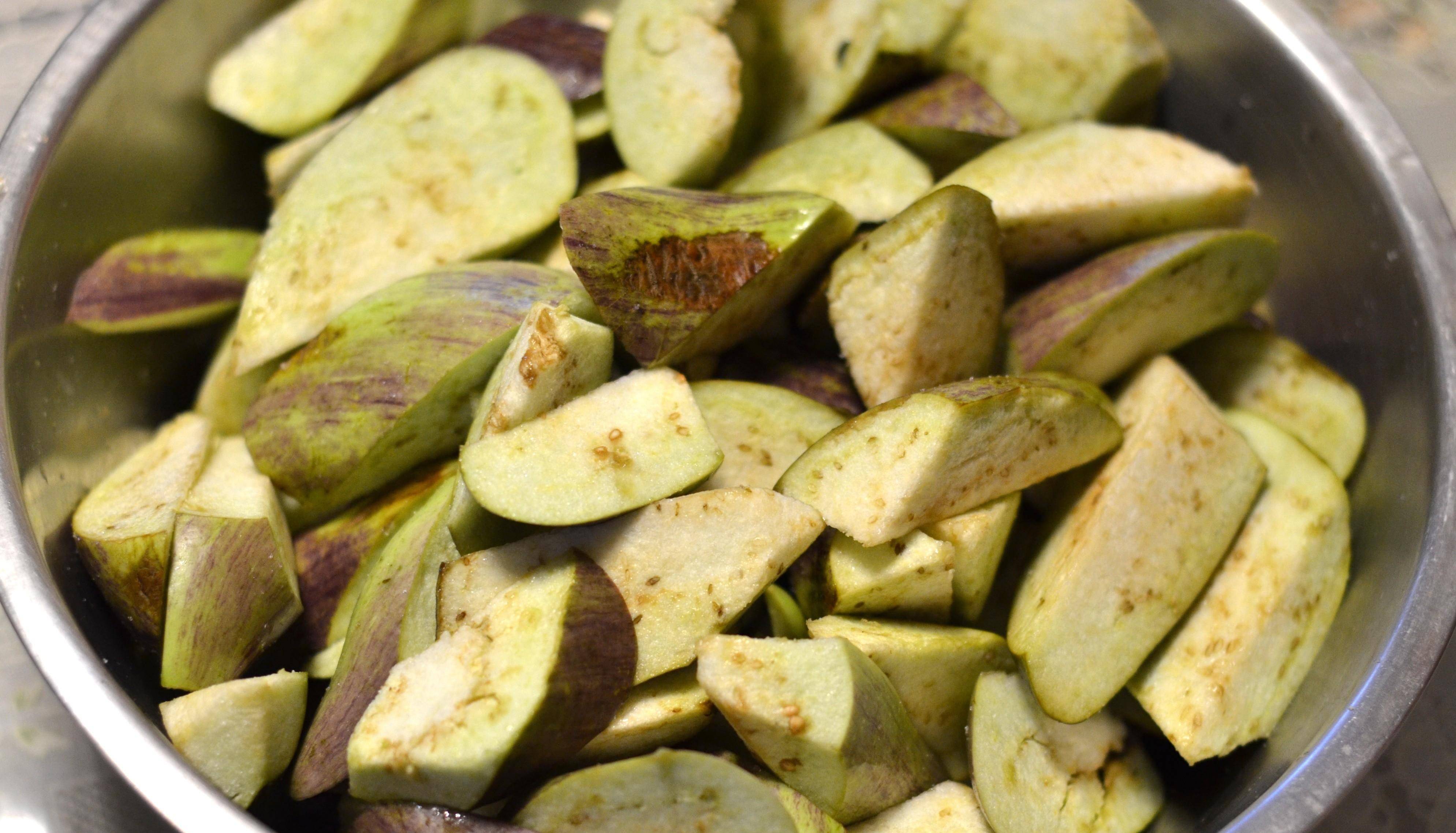 茄子切成滾刀塊,茄子的營養也是非常豐富,含有蛋白質、脂肪、碳水化合物、多種維生素以及鈣、磷、鐵等多種營養成分。常吃茄子對身體非常有益處。