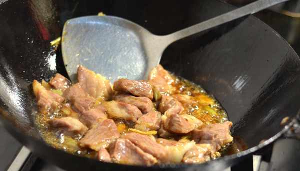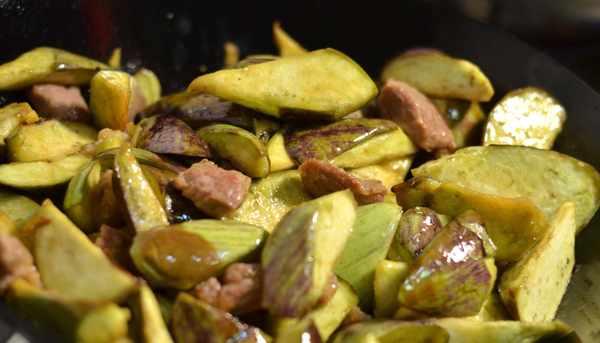 再向豬油中加入少許食用油,用大火將油溫燒開,放入蔥薑炒香,這時加入切好的精瘦肉翻炒,然後放入茄子翻炒,期間倒入五香粉,少許老抽醬油,生抽醬油,少許鹽,一個大料等調料,翻炒均勻。
