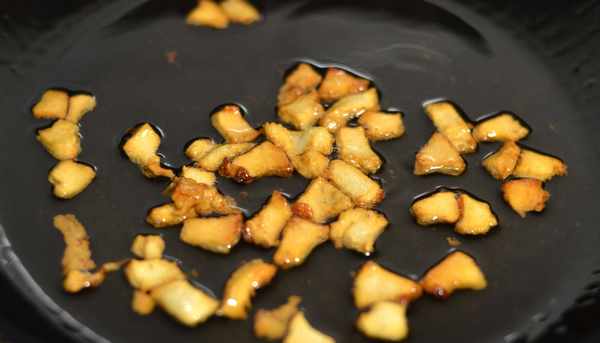 現在我們先往炒勺中加入少許的水燒開,倒入肥肉塊,中火慢慢熬制,煉制出豬油。把肥肉煉成油渣即可撈出。