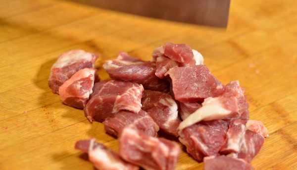 現在再把豬肉切塊。註意切肉時肥瘦要分開切,肥肉我們要先煉成豬油,炒菜時使用。
