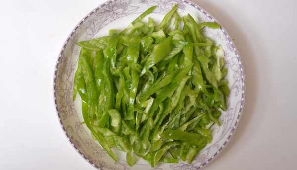 然後我們再把青椒切絲,大傢要註意,切青椒絲,要從中間切開,先把辣椒中間的辣椒筋和辣椒籽去除,然後再把尖椒切成絲備用。這樣操作,辣椒的口感就會很平和,不會特別的辛辣。
