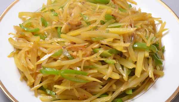 食材準備好瞭,我們現在開始炒菜,熱鍋冷油,燒開後,放入少許蔥薑蒜炒香,再放入適量的花椒粉,倒入泡好的土豆絲,翻炒。期間加入適量的鹽,生抽醬油,炒至八成熟時,放入青椒絲和適量的蒜末一起翻炒。炒熟後再加入少許的陳醋和香油提味兒。