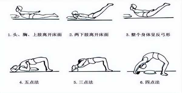 “五點式”的方法是:把頭部、雙肘及雙足跟作為支撐點,使勁向上挺腰抬臀。腰背肌功能加強後可改用頭部及足跟三點作為支撐的“三點式”鍛煉方法。鍛煉應循序漸進,逐漸增加,避免疲勞。