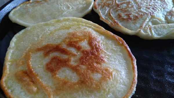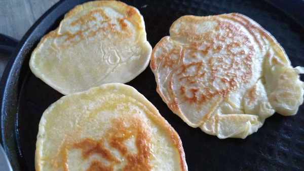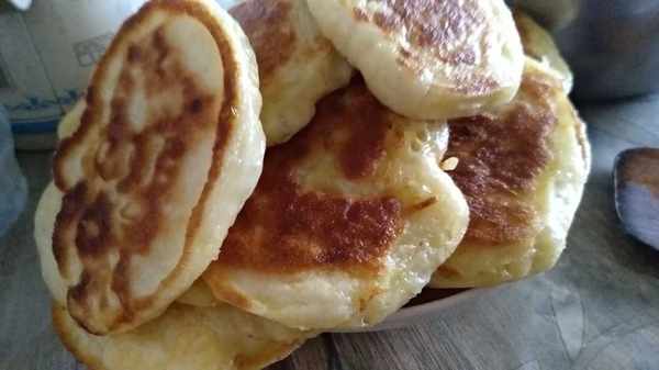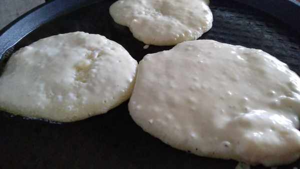 今天我做的是第一種,把面和水,糖,酵母等放到一起,攪拌成糊狀,醒一小時左右就發好瞭,然後平底鍋加熱放油,用勺子一次舀兩勺面糊開始烙,烙至兩面金黃就可以出鍋瞭。