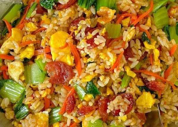 食材準備:米飯、土雞蛋、臘腸、胡蘿卜、油菜、蒜末。