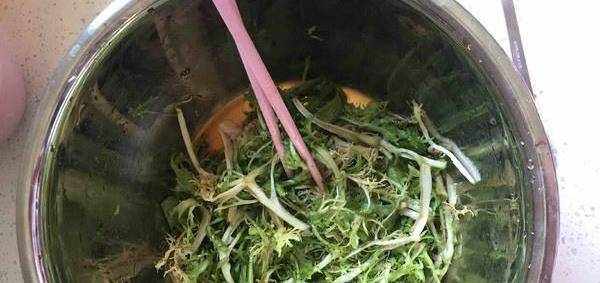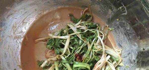 4.將芝麻醬倒入苦菊中攪拌均勻,加入辣椒攪拌均勻