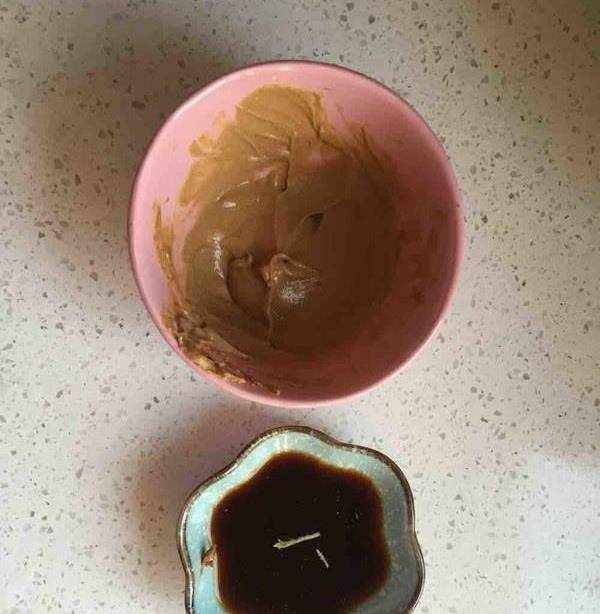 3.將芝麻醬用冷水攪拌成糊狀,將混有苦菊的湯倒入小碟中,加入芝麻醬如圖所示攪拌