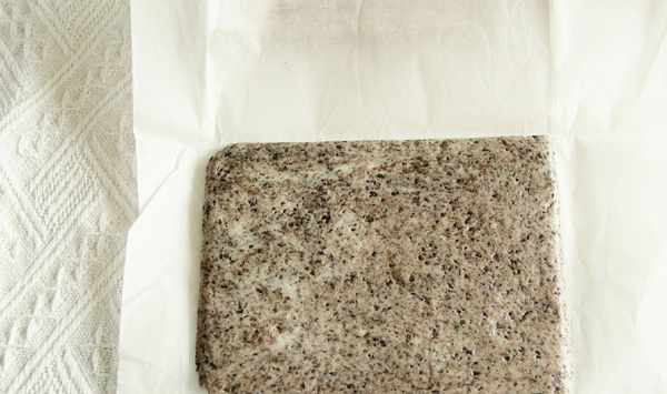 步驟8、借助油紙,整形成1CM厚的長方形。密封冷藏30分鐘或者冷凍10分鐘定型。