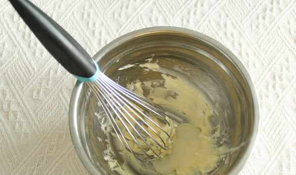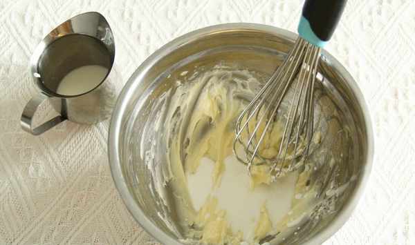 步驟5、分3-4次加入常溫牛奶,攪打至混合再加下一次,直到牛奶全部加完。