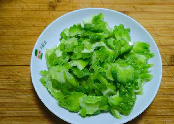 ②切掉苦瓜頭尾,洗幹凈表面。對半切開,挖掉裡面白色的瓤,洗幹凈後切小塊。加入一點鹽醃制10分鐘,去掉多餘的苦味。把醃制好的苦瓜淘洗幾次,瀝幹水分。