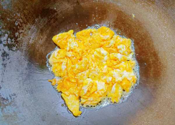 ①我們把雞蛋打入碗中,加一點溫水攪拌均勻。鍋中滑油,倒入雞蛋液。等底部微微定型後用鏟子向上鏟起,再快速翻炒成塊狀,盛起來。