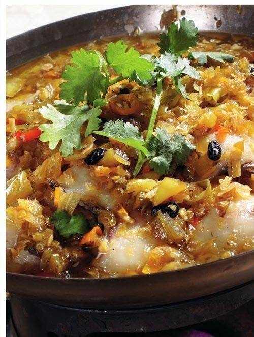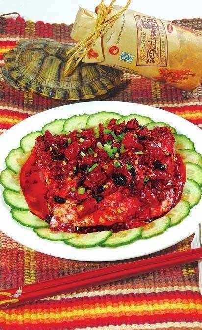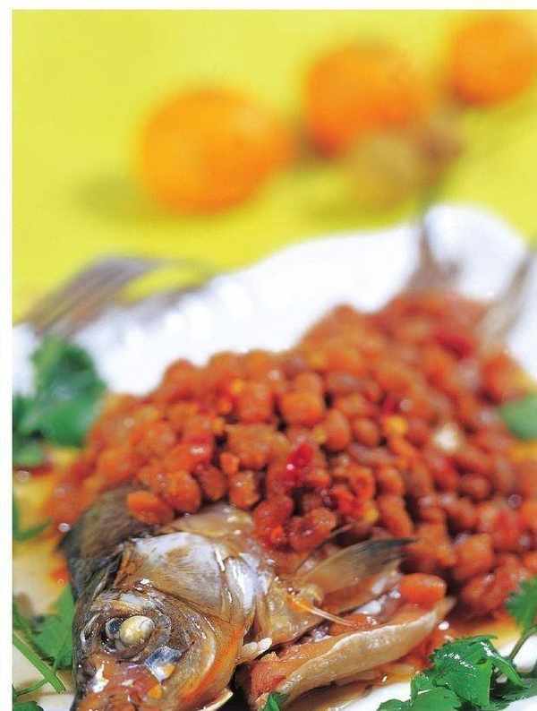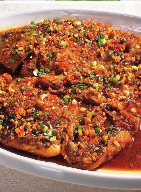 3 鍋內留底油,下豆豉、幹椒段炒香,再蓋在魚塊上,入籠用旺火蒸 8~10 分鐘取出,淋上燒熱的紅油、香油,撒上蔥花即可。