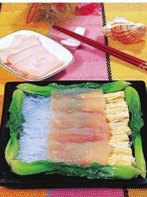 原料:才魚肉 150 克,香菇 3 克,冬筍 3 克,胡蘿卜 2 克,白蘿卜 2 克,萵苣 2 克,黃瓜 2 克,小菜膽 10 個,雞蛋 1 個,枸杞 2 克。