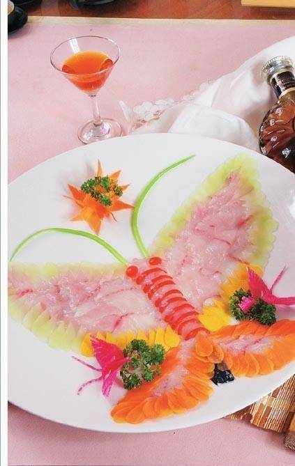 3 將魚片用雞蛋清、水淀粉上漿,與胡蘿卜片、南瓜片、萵苣片、紅椒圈、香蔥一起在盤中擺成蝴蝶形狀。