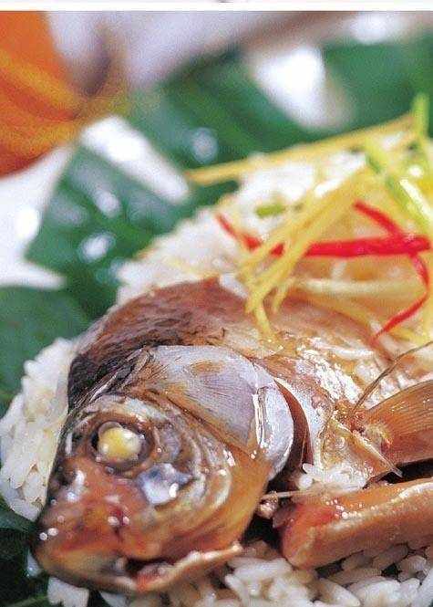 3 將鯽魚放在荷葉上,撒上薑絲、蔥段,糯米飯放在魚身周圍,再放入蒸籠,上火用旺火蒸 5~6 分鐘,取出夾去蔥白段,放入蔥綠絲、紅椒絲,淋入熱油即可。