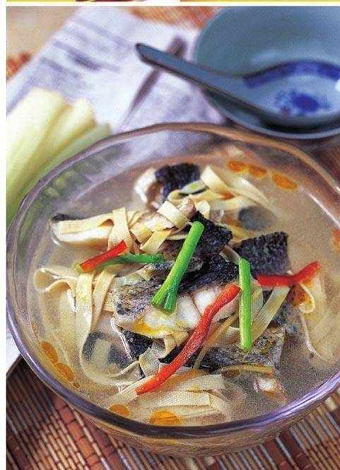 3 鍋內放豬油,下入薑絲煸香,倒入冷水,放入瓦塊才魚,燒開後放料酒、鹽、味精、雞精、蒸魚豉油、白醋、青椒,改用小火將才魚湯煨燒成乳白色,下入千張絲煮至千張皮回軟,夾去青椒,出鍋裝入沙鍋中,撒上蔥段,帶火上桌。