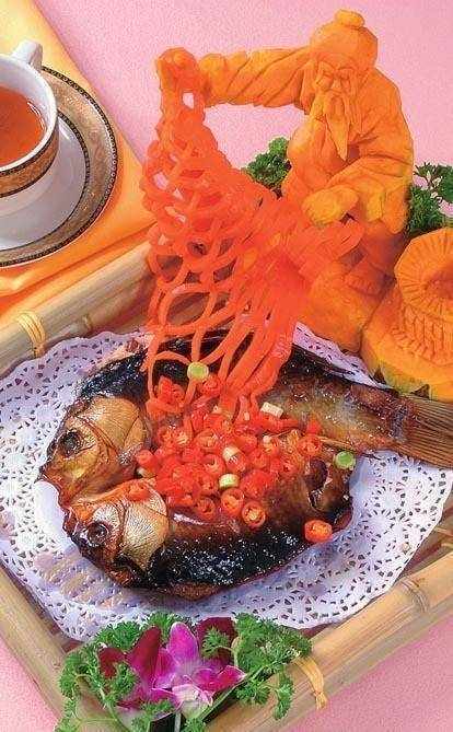 原料:才魚 1000 克,胡蘿卜片、南瓜片、萵苣片、紅椒圈各 10 克。