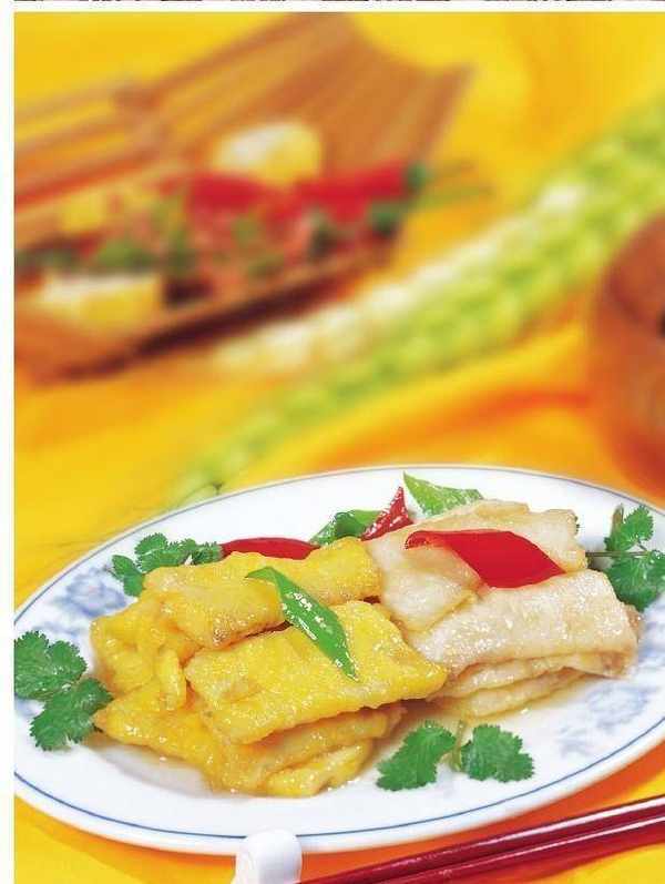 1 將才魚肉切成薄片,一半用蛋黃、精鹽、味精、幹淀粉上漿入味,一半用蛋清、鹽、味精、幹淀粉上漿入味。