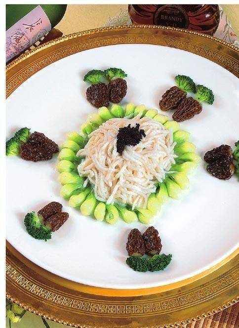 原料:羊肚菌 300 克,才魚 1 條(約 500 克),肥肉 100 克,菜心 150 克,魚子醬 50 克,西蘭花 200 克,雞蛋 2 個。