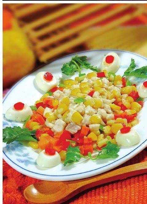 原料:凈青魚肉 150 克,熟玉米粒 100 克,青椒、紅椒、胡蘿卜各 5 克,雞蛋 1 個。