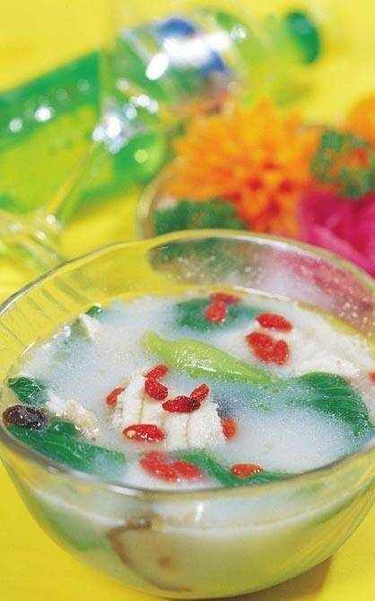 原料:才魚 1 條(約 750 克),水發香菇 10 克,菜膽 10 個,枸杞 3 克。