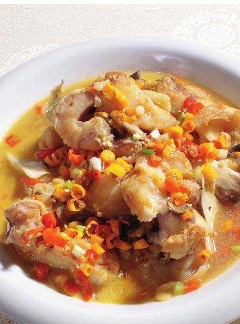2 鍋內放鮮湯燒開,下入薑片、熟豬油、魚骨,待湯汁乳白、味香濃鬱時,撈出魚骨,下入小米椒、豆豉,隨即放魚肉塊,放鹽、味精、雞精、蒸魚豉油調味,待肉熟湯鮮出鍋,帶火上桌。
